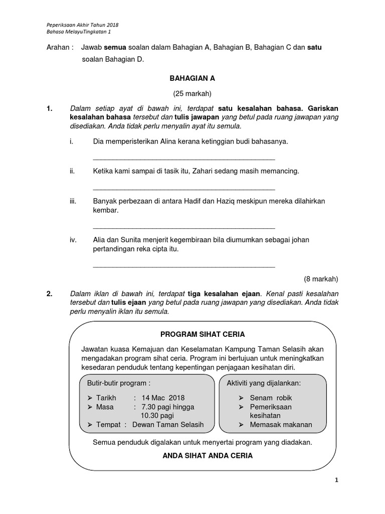 Soalan Peperiksaan Akhir Tahun Bahasa Melayu Tingkatan 1 Pdf